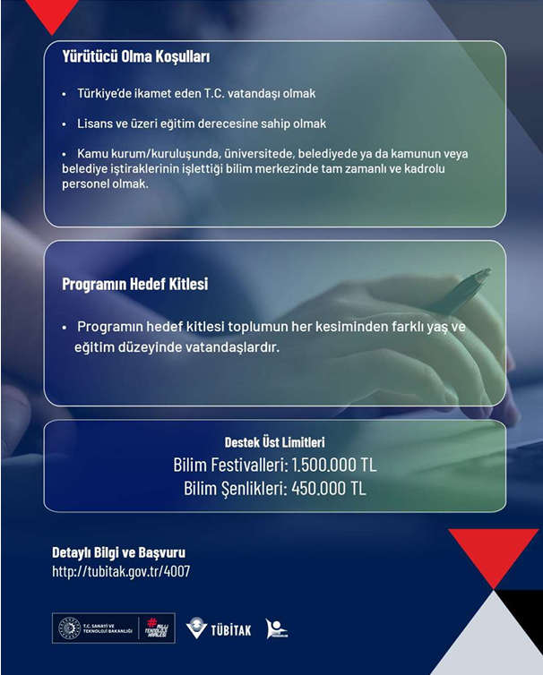Bu kapsamda TÜBİTAK Bilim Ve Toplum "4007 Bilim Şenlikleri" Destek Programının 11.Çağrısı yayınlanmıştır.