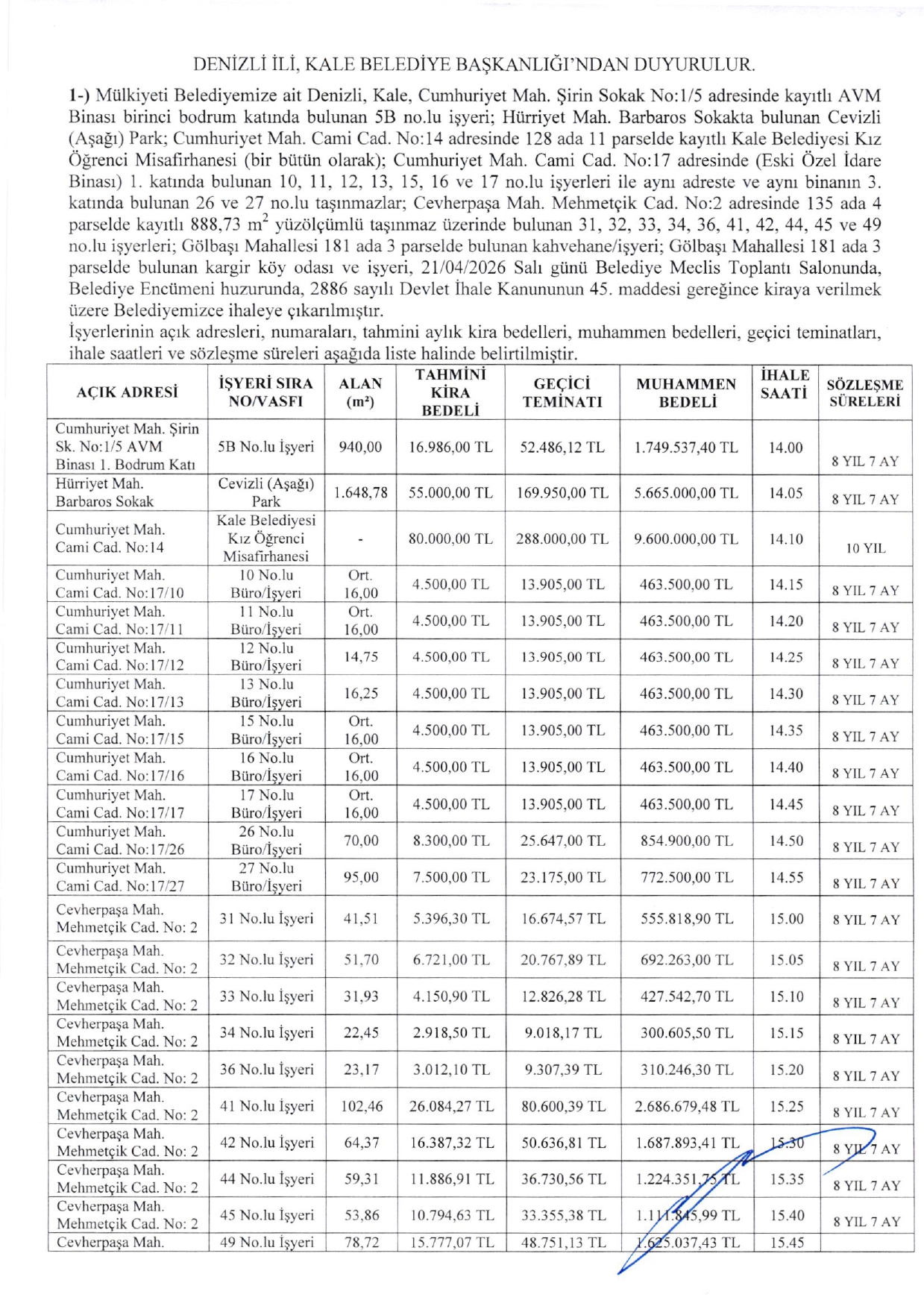 Kale Belediyesi Kiralık İşyeri İhalesi