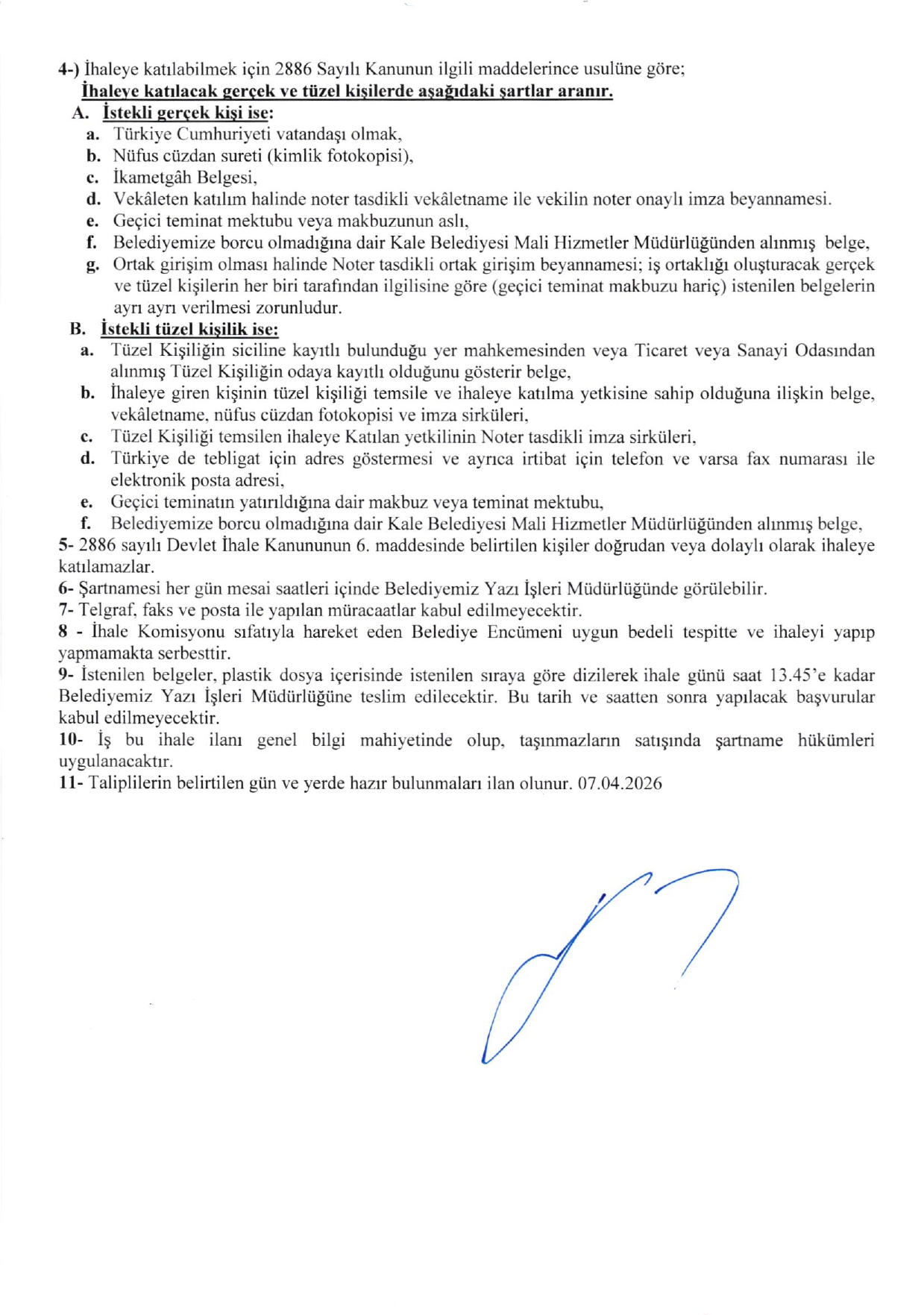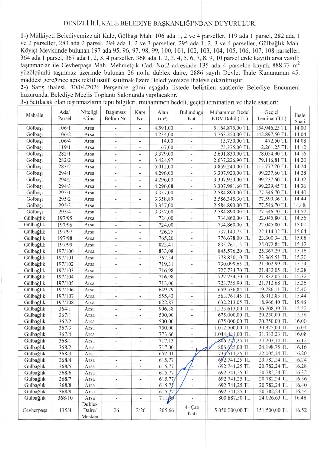 Kale Belediyesi Satılık Arsa İhalesi